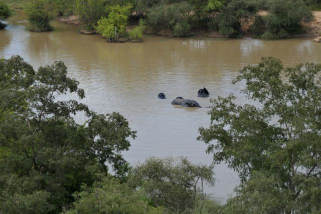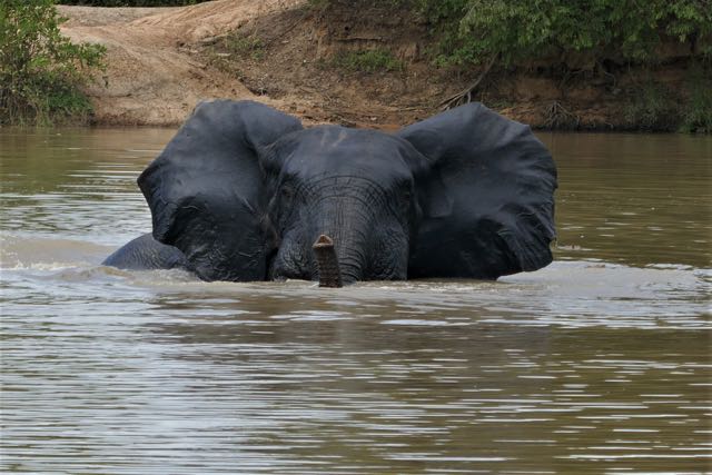 On our return an hour later, no-one seemed to have moved very far. I sat down to wait for the promised witching hour of 11am, but then the first of the positive TIAB events happened. James had been chatting to one of the rangers, and, looking up, suddenly asked if I’d mind going out on my own. This couldn’t be right; maybe we were going to pick up more people at one of the two lodges inside the Park. One of the drivers un-parked the budget option of the available game vehicles – no roof covering, and certainly no air-conditioning other than the au naturel variety (which I infinitely prefer) – moved it forwards and bade me ascend. I was followed by James’ ranger, now introduced as Sadiq, complete with an elderly rifle over one arm. When we stopped at the Mole Motel just up the track (such an incongruous name given its location), I assumed that others would emerge – perhaps the two Brazilian girls I’d met at the airport the night before – but it seemed deserted. Sadiq got out of the vehicle and beckoned me over to the edge of the turning circle. Just as I was opening my mouth to comment on the unexpected view across the gorge, he pointed: “Elephants in river. We go.” I gasped. Leaving the unfortunately-never-named driver behind, we started down a rocky path towards the river. I could barely contain myself. Legs still wobbly from the weekend’s ascent to the Wli Falls, thrilled to be back in Africa and seeing elephant for the first time in over four years, yet nervous to be on foot through dense vegetation in a national park, it was all I could do to focus on putting one foot not too noisily in front of the other. Did Sadiq know what he was about? He took us round the back of a deserted hut and then we emerged, near the water’s edge. Four male elephants, one a monster of an old guy, were almost fully submerged in the middle of the river; what was showing of their skins glistening and un-customarily dark grey. It wasn’t long before the old boy spotted us, the end of his trunk doing a snorkel routine from below the surface, swivelling round to point in our direction, and, locking onto us, the rest of the head followed. He gazed over at us, flaring his ears, trunk now out of the water and raised. I gulped. According to Sadiq, he’s an unpredictable elephant – thanks, now you tell me! – but we were clearly, in his mind, far enough away not to be any kind of threat, though he still mustered his acolytes and, after a final splash, the four of them made languorously for the far shore.