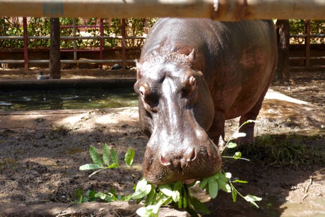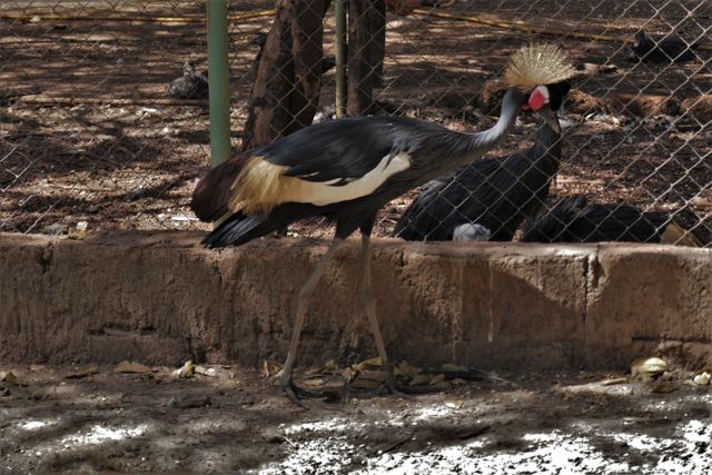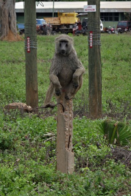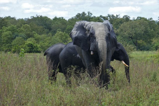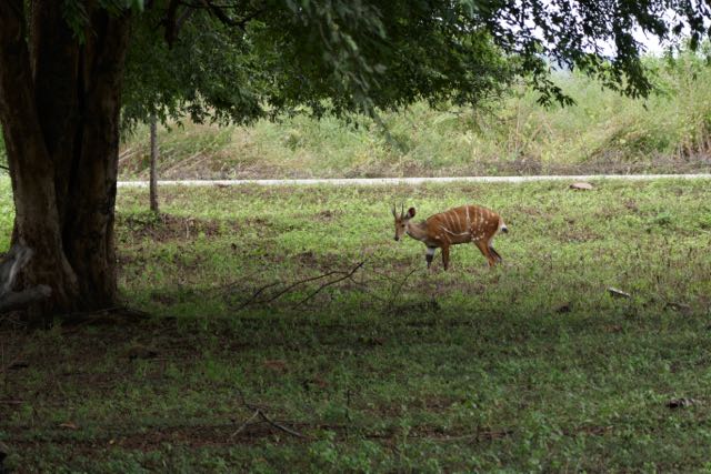 Eventually we left them to it, Grumpy even seeming to wave us off with his trunk in one of my last photographs. Reunited with the driver who’d joined us for the last couple of animal progressions, we boarded the safari vehicle and continued, somewhat rapidly, on our way. I assume that the guides here are on the clock: that’s how they’re charged out to tourists, so maybe we had reached our time limit. But we couldn’t help stopping for one of the prettiest of the buck species in Africa, a small herd of female kob with their ever-twitching ears, soulful eyes, and delicate build. There were also bushbuck, warthog and baboon; a heron wrestling with a fish, a tree-ful of egrets, and a woolly-necked stork flapping slowing overhead. Three ecstatic grins drove back into the compound.