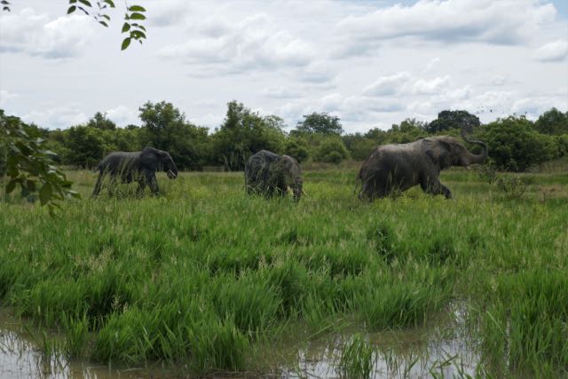 A little further on, as Sadiq had predicted, our path intersected with the elephants emerging through the bushes to our left. Sadiq carefully positioned us so as to be out of the animals’ direct line of movement, but we had ringside seats to watch them carefully and deliberately ruin their newly scrubbed up and glistening appearance with trunkfuls of dust and mud. It would take a little while for the sun protection to even up; in the meantime, we had the amusing spectacle of these regal and intimidating creatures turning stripy and blotchy, the elephants clearly conflicted by the need to reapply by their sunscreen yet easily distracted by the lushness of the grass around them.