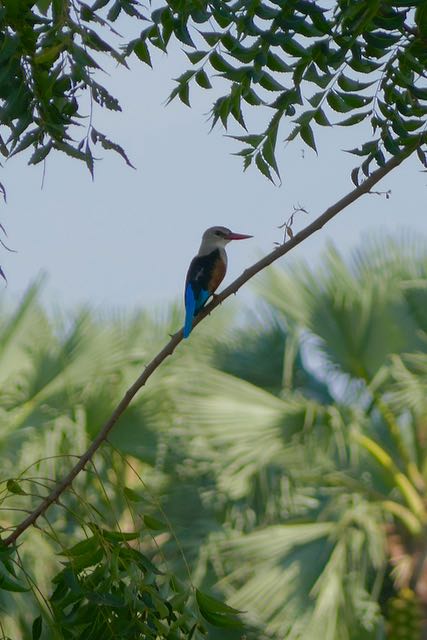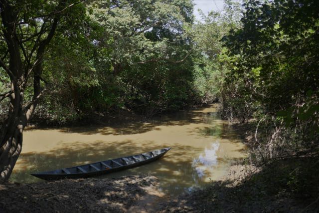 We’d picked up Baba as the local area guide, but, as is the way of things, we evidently needed a canoe guide, and, as he was clearly too important to paddle, we also collected a couple of younger boys to do the hard work. I felt distinctly and embarrassedly like a Raj memsahib with so many “staff” to take me out on the river. But I don’t think the boys batted an eyelid, regarding it as a bit of a jape and a chance to natter to their mates. Tranquil it wasn’t, though to their credit they all kept their eyes peeled, pointing out an impressive array of small colourful birds, such as the malachite and blue-breasted kingfishers, the red-throated bee-eater and the blue flycatcher. In what was otherwise a monochrome environment, the water and trees hotly unmoving, these bright blasts of fast-flying colour were fabulous. I could happily have stayed out there much longer than whatever was my allocation.