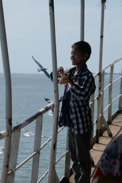 Once released by the airport – although it had been a domestic flight, passport and visa checks were carried out, as they have been almost every time I’ve crossed a state border here – I was approached by only one hopeful taxi driver (poor pickings when there is only one flight a day). We agreed a fare for the half-hour trip, and, after loading me and my bag into the car, he paused in front of a teahouse to talk to the occupants… three of whom proceeded to join me. With “My brother!”, “Grandmother!” and a little boy (I’m not sure whether he was my driver’s nephew or son) piled in beside me, I felt as if I was invading a family outing. There was certainly a relaxed festive spirit amongst the adults, Junior looking in need of the nap his grandmother kept coaxing him towards, but much too interested in his surroundings to take much notice of her. When The Eagles’ “Tequila Sunrise” came on the radio – oddly for Myanmar, the original, not a cover – as I sipped a can of tamarind juice, I giggled. It couldn’t get much more surreal. We bucketed towards the coast as if enacting the old Cliff Richard number.