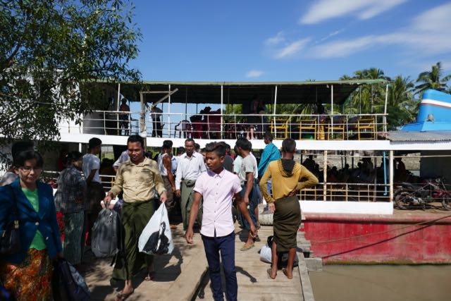 The journey itself was otherwise delightfully uneventful. I dozed off from time to time, in common with most of my fellow passengers, scribbled a bit of my diary, read a bit of The Book, and otherwise simply sat and watched the world go by, quite literally. We passed the occasional hamlet, little collections of woven-walled and thatched-roofed huts on stilts at the edge of the water. Water buffalo grazed beside the river. From time to time fishermen would appear and then disappear in our slow chugging wake. There were occasional ranges of hills, dotted with a golden zedi or two, in the distance on each side of us. Cattle egrets provided uneven white dots to the verdant green fields. A flock of seagulls joined us when a couple of the kids decided to throw out handfuls of the snacks that they’d bought, the birds swooping and shrieking as if we had fish on board. I was particularly taken to see one kid have so much fun with this that he begged another hundred kyat from his mother to buy more. I looked up Google Maps to see where we were, but even this app struggles with names in this part of the world. It was a glorious day, and if the seat had been even slightly more comfortable, I’d have been happy for the journey to continue. As it was, by the time we turned into the canal to the north of the main city, I was ready to move on.