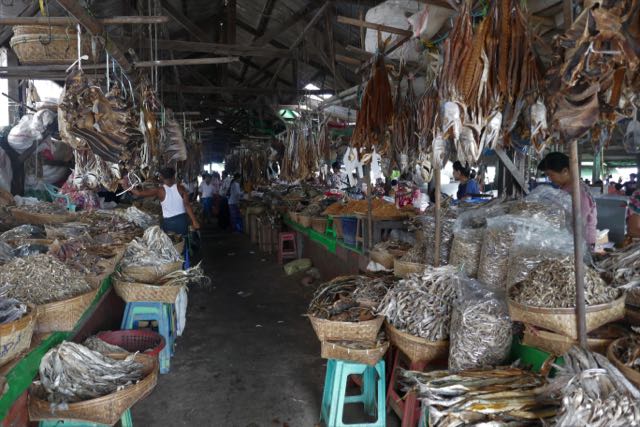 As an insurance policy against plans going wrong earlier in my trip, I had planned to have two nights here, and pretty much exhausted what sights there were in three hours. I had dinner with the Kiwis the night we arrived at pretty much the only restaurant in town, and that was of the Burmese teahouse variety, firangis strictly not anticipated though treated with tolerant indifference. The food was tasty – Rakhine curries having more poke to them than much of the Burmese food I’d eaten to date – but didn’t entirely agree with me, so the next evening I found some E-number filled white bread and dined in my room. The market, however, was fascinating. It’s huge, and has two particular specialisms, dried fish and rice. It looked as if there was effectively a rice exchange at one end of the market, a couple of rows of dingy little shops containing nothing but bulging sacks, with the sole member of staff hunched over a desk on the phone. Dried fish is a bit of a Myanmar specialty, and I’d been introduced to it early on, if not quite voluntarily: the aroma can be particularly carrying. Here, however, I could see the drying of big fish in action, a curiously complex process to retain the overall integrity of the fish.