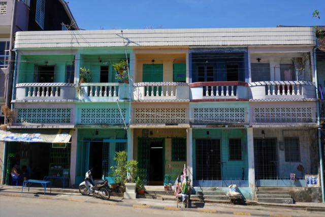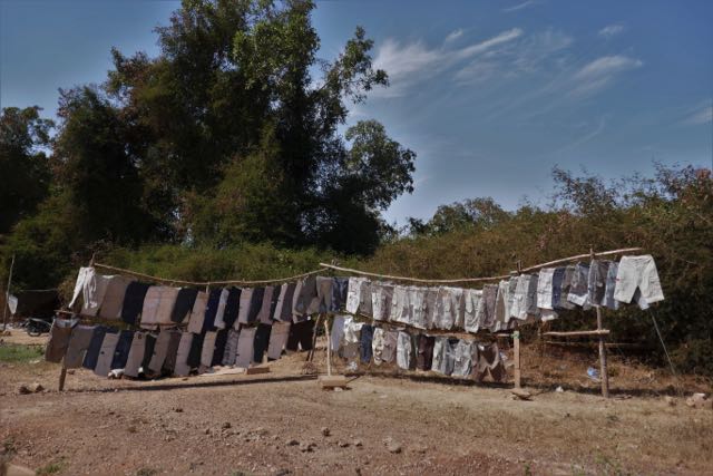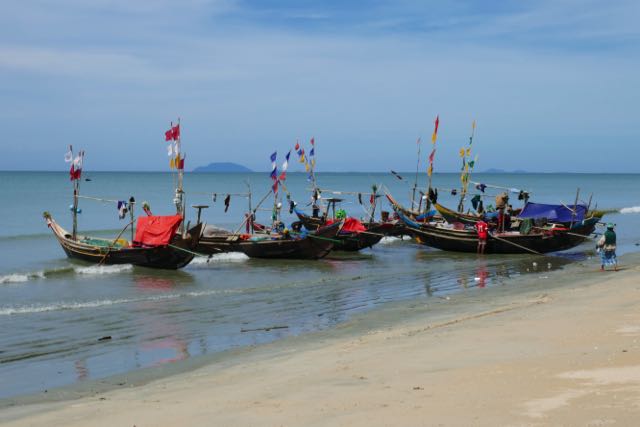 A gaggle of fishing boats was wedged into the sand at the water’s edge while the fishermen offloaded their catch for the morning market. My hostess at Coconut Guest House went along each day to see what she could find, listing the resulting options on a whiteboard in the dining area that evening. After unloading, a couple of guys waded out with each boat until it was sufficiently re-floated for one of them to scramble aboard and take up the oars. These were higher-prowed and wider boats than the Inle Lake longtails, though their engines worked on a similar basis, here with two long-shaft propellers, one each side of the stern. A bunch of flags was attached to a couple of poles in the bow, not prayer flags, as such, and, other than pure decoration, or possibly identification, I couldn’t quite see their purpose. A kind of “boom” stretched from the poles back towards the stern, but its primary purpose seemed to be to provide a frame across which a tarpaulin could be stretched to give shade amidships. And, on a couple of boats, to hang laundry.