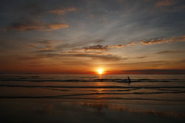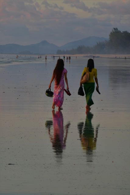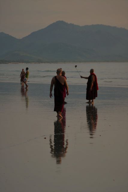 That evening, I went back down to the beach to enjoy what promised to be my best Myanmar sunset so far (up against some stiff competition in Bagan and Inle Lake, I should add), and it was then that I really saw the locals out to enjoy themselves. With the exception of one lone fisherman wading along, parallel to the beach, with his bamboo-framed nets (was he one of those I’d seen that morning?), everyone was out to relax in the last of the light. Another football game was in progress. Kids mucked around in the shallows. A couple of beautifully-dressed young women giggled at the water’s edge, holding up the edge of their htameins in one hand, their sandals in the other. And to my huge delight, I saw that downtime applied to the clergy as well. Ahead of me, a couple of monks were taking photographs, one of them deliciously wielding a selfie stick. A third monk joined them briefly, then walked back up the beach… and returned carrying an inflated inner tube under one arm. He left his uttarasanga (cloak) with his colleagues and, still garbed in his full-length antaravasaka (sarong), waded out into the water to lounge around in a rubber ring. As the sun slowly sank towards the horizon, I smiled. What a nutshell of life to have witnessed, all to the backdrop of a sunset that really was the best yet, no fringe of pollution or haze to hide its final dip below the horizon, no clouds or hills in the way.