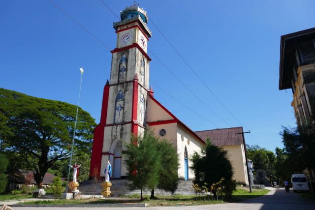 The next day I set off to explore the town. Mawlamyine itself is a tranquil, slightly sad, backwater, its colonial architecture scattered and crumbling, although, with clear blue sky and bright sunshine, it had a vibrant colour that both Yangon and Mandalay had lacked. St Patrick’s Cathedral has been quaintly Burma-ified, with hti-like gold filigree and extra colour added to the otherwise simple Christian spire, and its pretty wooded graveyard is still littered with Victorian casualties of the brutal tropical climate. Only at the northern end of Lower Main Road, with its chaos of open-air and covered markets, is there a frenetic buzz of activity, motorbikes winding their way between customers to deliver high-piled goods.