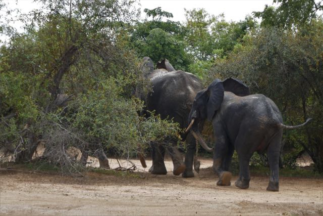 And so our stroll with the pachyderms continued, Sadiq second-guessing the elephants’ trajectory, as it were, and moving us into position behind or to one side of the animals to watch them safely. It was a mini lesson in elephant behaviour. A little bit of trumpeting. Some ankle scratching. Some displaying of “manhood” (to quote Sadiq). A bit of kicking the ground to loosen dirt for application, via trunk, to still-damp skin. And lots of feeding. If an elephant can stuff its face, these guys were certainly doing just that. There was a bit of reaching up for a branch or two, but, to be honest, why bother, when just around the corner is more grass than four male elephants could eat in a week?