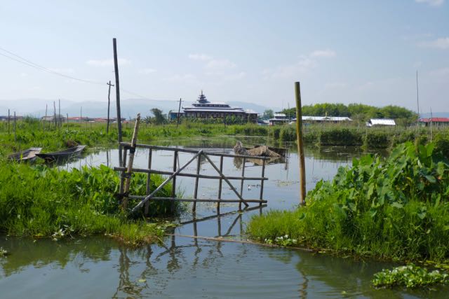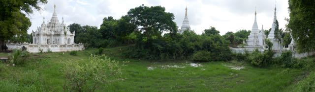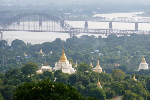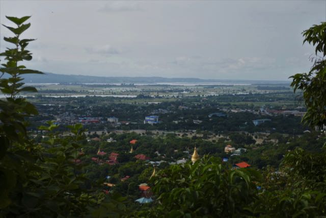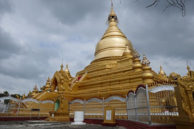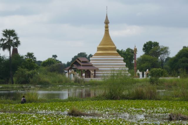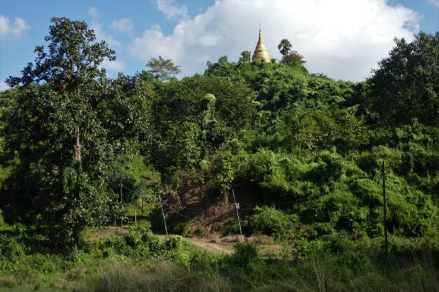 …until I got to the Shwetaung Paya. I guess I should have believed the Book when it said “it’s accessed by a few trails largely lost under thick vegetation”. That’s putting it mildly. The uncharacteristically golden stupa was clearly visible at the top of the hill, so I stopped to ask a monk who was pottering outside what was clearly “lower” Shwetaung Paya the way up. He pointed vaguely behind a grazing almost-albino gelding, and sure enough, there was the bottom of the track. Which was about as visible as it ever got. Not to be deterred, I scrambled upwards, looking each time for the least thick growth through which to plough my way. I came across a second track that approached from the other side of the ridge, so made a note to myself: look for the yellow flower (which I’d just passed), and ignore the red (which I could see in front of me). Woe betide me if a flower-picking supplicant appeared while I was up top. At one point, I had to scramble up a slope, grabbing onto whatever branch or undergrowth didn’t immediately give way. And yet the Paya gleamed above me, daring me to make it the whole way up. More by luck than judgment, I popped out at the foot of overgrown stone steps to be greeted by a pair of chinthe, the Burmese lion-like creatures that often guard temple entrances. I swore some very un-Buddhist things at them, and the golden stupa beyond. But the views were fabulous, and after half a bottle of MAX, Myanmar’s answer to Fanta, I was prepared to enjoy them; they had been worth the climb. Yet, cautious of the perils of gravity on the unwary, I messaged two of my siblings to let them know where I was and what to do if they didn’t hear from me after a certain period of time. Extraordinary as it was, even here, in the back of the back of beyond, I had a good mobile signal. The travel gods were with me, however, and I made it safely back down the hill with only a few scratches.