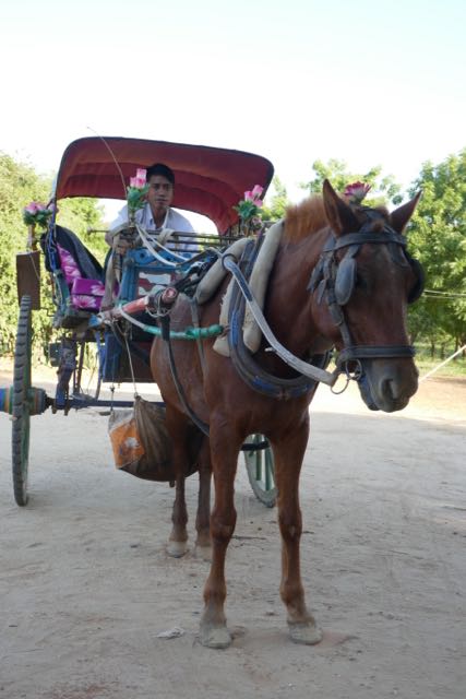 The day trotting around in a horse-and-cart was luxuriously relaxing. While I admit it’s not the most comfortable form of transport – Konaing’s cart is lined with foam mattresses, but the height of the canopy doesn’t anticipate European inches – it was wonderful to be pottering along so gently and quietly. Mu-Mu didn’t bat an ear or miss a step, no matter what other transport might have been doing, even on the short stretch that is as close as Bagan comes to dual carriageway, with its occasional buses. I made sure to thank her each time I dismounted for a temple – all, um, fifteen, I think, that I visited that day – and to ask her if she was all right to continue each time I re-mounted. Konaing seemed touched at this, and he was clearly very considerate of her himself, making sure to rest her in the shade and imposing a lunch stop that was primarily for her benefit rather than ours.