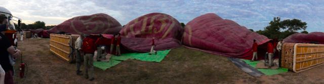 The hot air balloon ride was phenomenal. There are some experiences for which it’s just worth paying the money. Trekking with gorillas in Rwanda was one, flying over the Nazca Lines in Peru was another, and this was definitely a third. Understandably, it’s an almost military operation, with 21 balloons between the three companies all being prepared for take-off from the same area at the same time. Battalions of minibuses collect the punters from a 7-km radius, depositing each busload to the correct campsite where hot coffee and shortbread is on hand (I was afraid, when I saw yet another busload join our group, that, in having a second cup of coffee, I might have dented their rations, but clearly serious caffeine needs are anticipated). Safety briefings are given by each pilot to their balloon-load, and then the acres of lifeless silk are slowly inflated by massive fans, each balloon remaining tethered to a nearby minibus. Everyone on the team of a dozen or so per balloon knows their role to the last inch. Ropes are tugged, silk coaxed, and even the inside of the inflating balloon is checked to ensure all is in order there. At a certain point the burners flare, and we feel an unspoken competitiveness with the other balloons: is ours going to be first? Which one’s lagging behind? Once the balloon is vertical and the signal is given, we clamber aboard. Final checks go on between pilot and ground crew with much radio liaison, and then suddenly we’re waving to the ground crew. Jokingly (we hope), the crew call “See you tomorrow”, when, in fact, they are each going to be keeping in close contact with our pilot to coordinate the minibus and tractor getting to the right landing zone. Ours was a day of “light and variable winds” and I gather our crew had their work cut out for them as Chris-from-southwest-London (most of the pilots are British), told them first one site, then a second, and then a third.