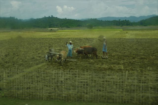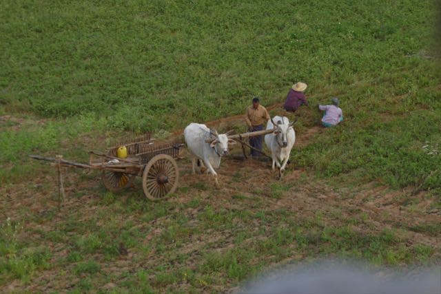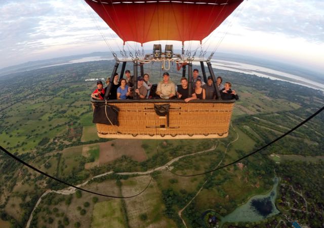 By the time we took off, the sun was just at the horizon. We’d all gone prepared with extra layers, but the heat from the burners, although they were only sporadically fired, was enough to keep us warm. The views were simply magical. When the burners weren’t roaring and the chatty Germans in the far end of the basket drew breath (our basket had five sections, the middle one being Chris’s “office”, with each of the other sections able to accommodate up to four people, although we were only 14 passengers in total), it was wonderfully tranquil. Somewhat randomly, as it seemed to us, Chris took the balloon up and down, searching for the most helpful wind on this slightly challenging day. At one point, I thought we were going to scrape the top of the palm trees. At other times, we had an endless view across the Irrawaddy to the north and west, and over to the extinct volcano behind Mount Popa, Taung Ma-gyi or Mother Mountain, to the south. But then we flew over a farmer leading his oxen and plough, a couple of women hunkered down on their haunches working in the field beside him, and I suddenly felt sickened. In this, one of the poorest countries in Asia, I had paid what was likely the best part of their annual income for a two-hour experience. I could only rationalise it on the basis that, overall, tourism is essential to the area, bringing in much-needed income that flows down through all levels, even to our farmer in the fields as he sells his crops to nearby restaurants. But it was still an uncomfortable realisation.