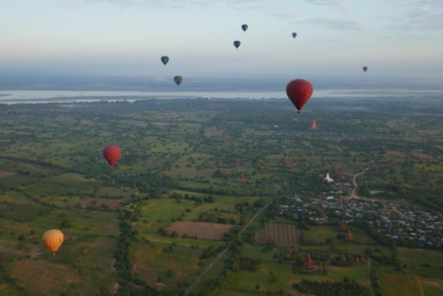 In Bagan, THE thing to do is to go for a hot air balloon ride over the monuments at dawn. Any later in the day and the temperature in this, one of the hottest parts of the country, makes flying infinitely less predictable, so the three companies operating balloons have decided to focus on the almost-guaranteed dawn departure. I was afraid I’d left it too late. The Balloons Over Bagan website said they had no availability until much later on in November. I was kicking myself: I’d planned my Bagan dates sufficiently far ahead that I could have booked it earlier had I only thought. With low expectations – even congratulating myself on the money I wouldn’t therefore be spending (it’s not cheap, of course) – I went into the “BOB” office the afternoon I arrived in Nyaung U. And ten minutes later came out with a booking for three days’ hence. All my virtuous thoughts about the unspent dollars went out the window; I had a happy grin meeting round the back of my head.